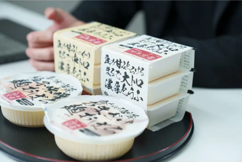 幾度もの試作を経て完成した「大トロとうふ」。この印象的なネーミングは、実は社内の試食会から生まれた。100名の社員たちに率直な感想を書き出してもらうと、その中に「大トロみたい」という言葉があったという。濃厚でなめらかな食感。まさにその表現がぴったりだった。