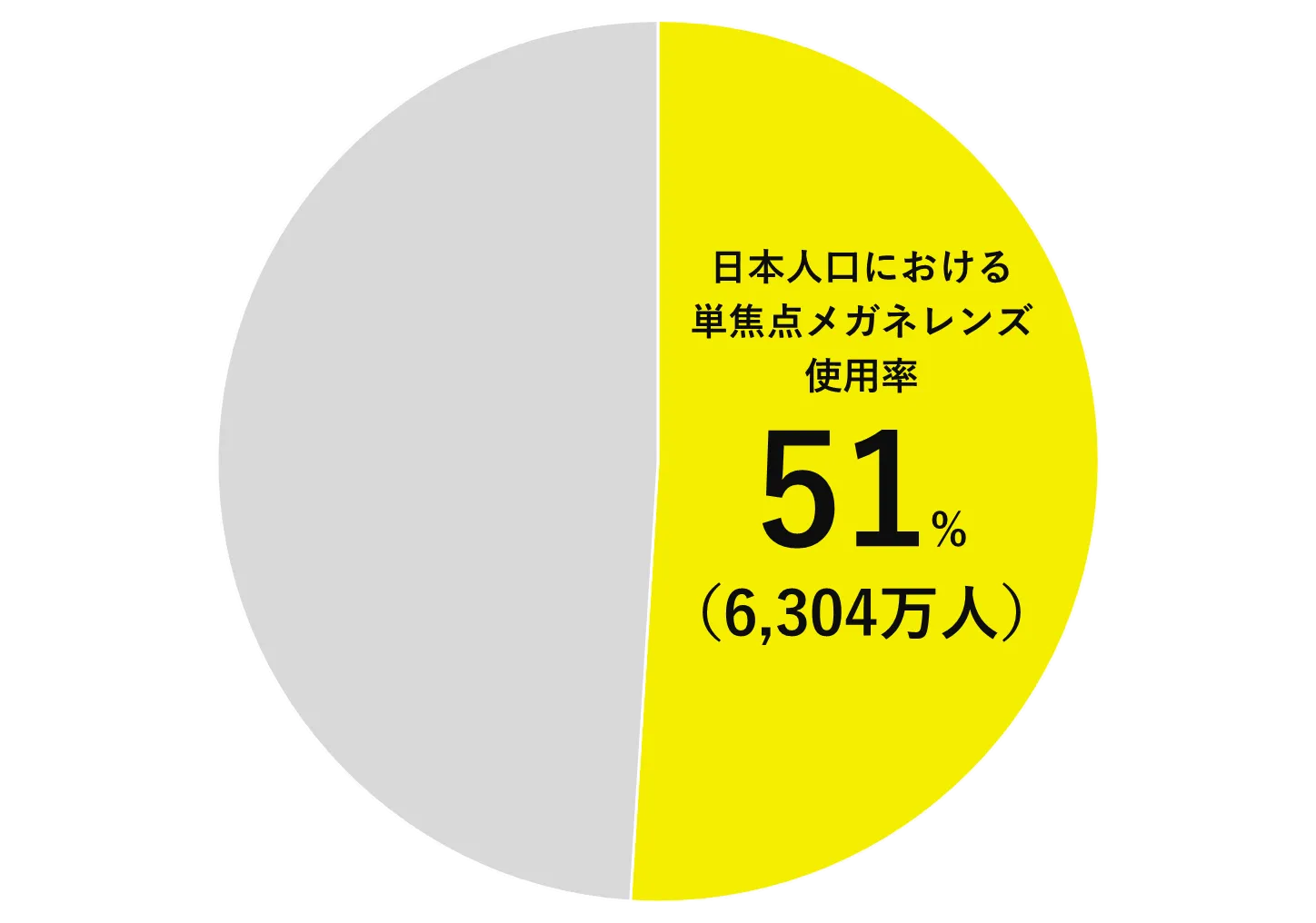 日本には約8,006万人のメガネ装用者がいるといわれていますが、そのうち近視・遠視・乱視などを補正する単焦点レンズの使用者は約6,304万人で、日本の総人口のおよそ51%を占めています。つまり日本人の2人に1人は、単焦点レンズを日常的に使用していることになります。