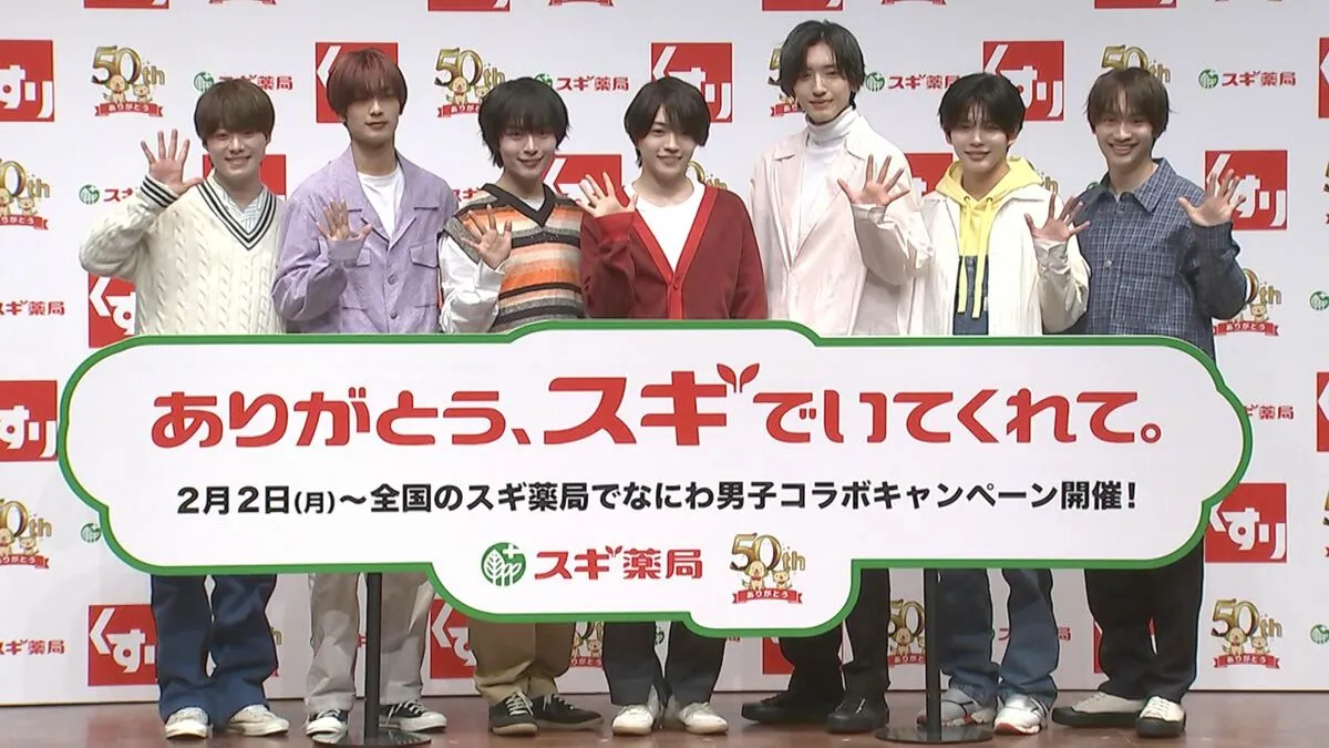 アイドルグループ「なにわ男子」の西畑大吾さん、大西流星さん、高橋恭平さん、長尾謙杜さん、藤原丈一郎さん、大橋和也さんが「スギ薬局50周年 新CM発表会」に登壇。7人がスギ薬局の新アンバサダーに就任することが発表されました。