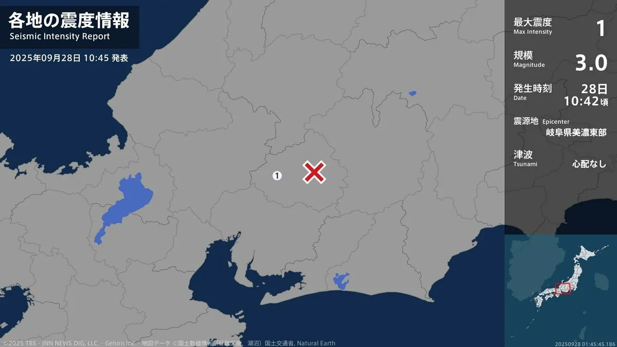 28日午前10時42分ごろ、岐阜県で最大震度1を観測する地震がありました。