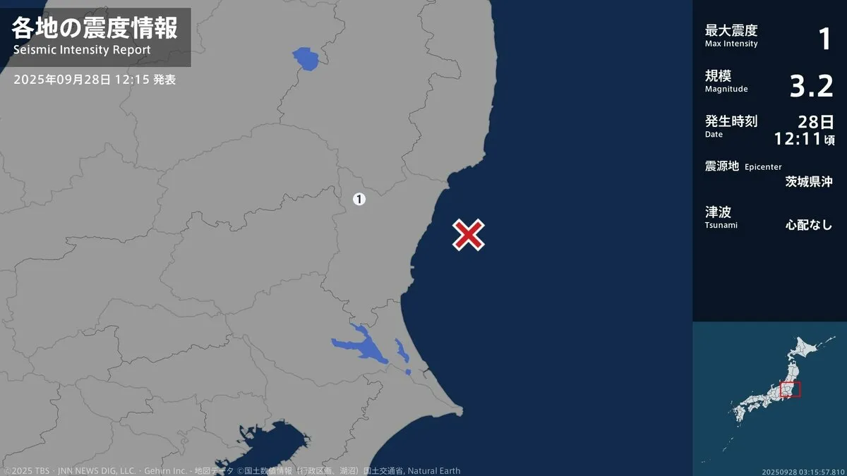 気象庁によりますと、震源地は茨城県沖で、震源の深さはおよそ50km、地震の規模を示すマグニチュードは3.2と推定されます。