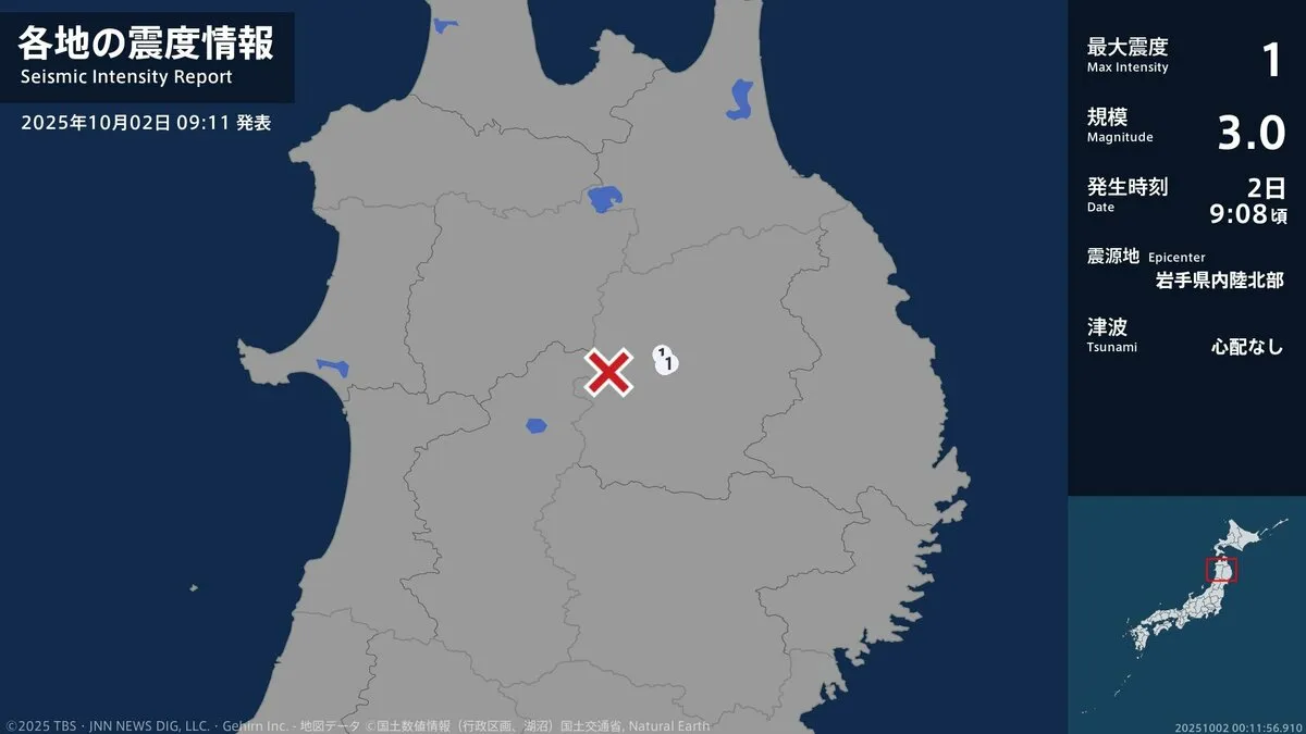 2日午前9時9分ごろ、岩手県で最大震度1を観測する地震がありました。