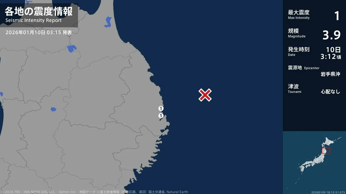 気象庁によりますと、震源地は岩手県沖で、震源の深さはおよそ40km、地震の規模を示すマグニチュードは3.9と推定されます。