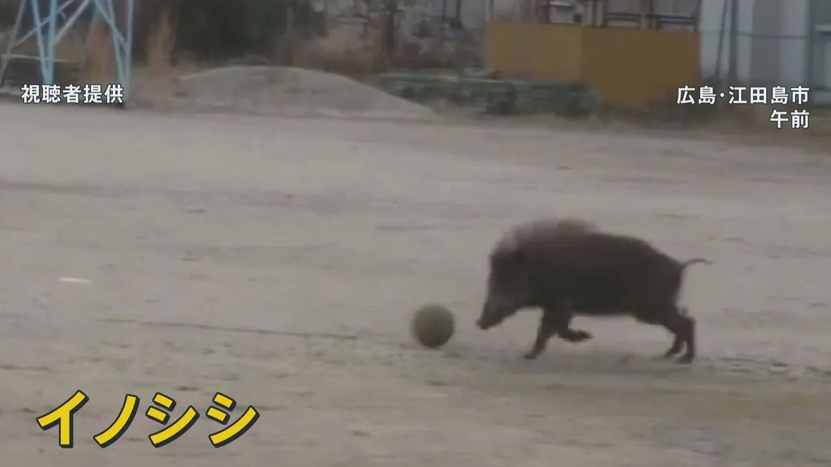 人気のない校庭でボールを転がし、時折くわえながら駆け回る1頭のイノシシ。鼻や前足を器用に使い、まるでサッカーをしているかのようにも見えます。10日朝、広島の小学校のグラウンドで一頭のイノシシが目撃されました。