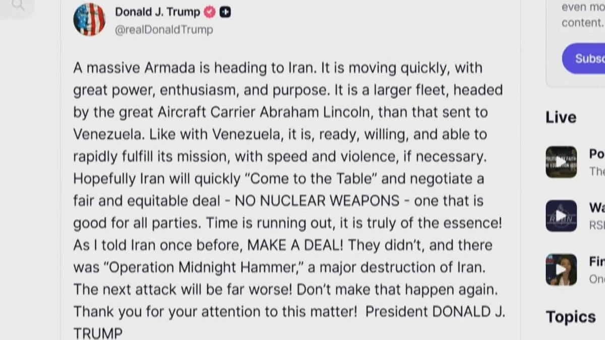 アメリカのトランプ大統領は28日、自身のSNSで原子力空母エイブラハム・リンカーンが先導する「巨大な艦隊がイランへ向かっている」と投稿しました。「ベネズエラの時と同様に必要なら迅速かつ暴力的に任務を遂行する準備ができている」としたうえで、イランに対して、核開発問題の解決に向けた交渉に応じるよう迫りました。