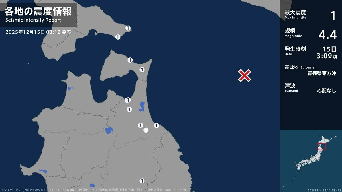15日午前3時9分ごろ、北海道、青森県、岩手県で最大震度1を観測する地震がありました。