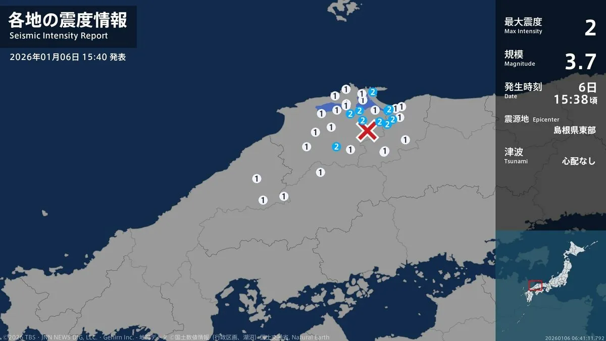 6日午後3時38分ごろ、鳥取県、島根県で最大震度2を観測する地震がありました。